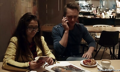 Nerdy brunette in glasses Lil' Candy is fucked hard by horny guy