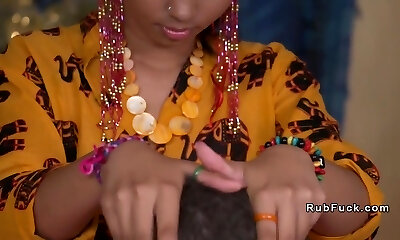 Bald ebony man penetrates ebony hottie with cat paws tattoo on her tits